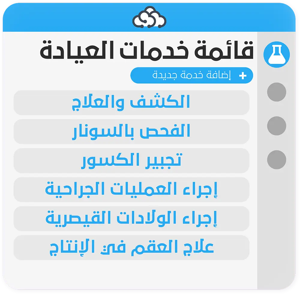 يساعد النظام العيادة البيطرية على توفير العديد من الخدمات لعملائها والتي تشمل الكشف والعلاج، والفحص بالسونار، وتجبير الكسور، وإجراء العمليات الجراحية وإجراء الولادات المتعسرة والقيصرية، وعلاج العقم في الإنتاج، الزيارات الحقلية، برنامج تجهيز العشائر، إجراء التطعيمات الموسمية. مما يوفر سجل منظم ووافي لإدارة المختبر لمتابعة جميع خدمات العملاء من النواحي التنظيمية والمالية.